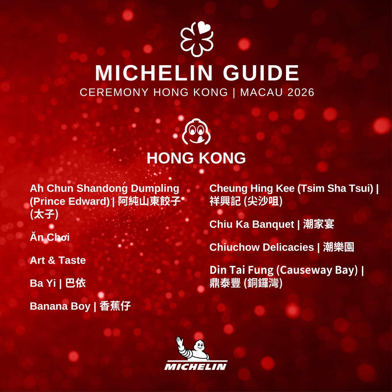 第18屆《香港澳門米芝蓮指南》將於3月19日揭曉最新星級餐廳名單,備受關注的必比登推介名單今日(12日)率先出爐,共有83間店家入選,其中香港佔70間,涵蓋粵菜、意大利菜、泰國菜等多種風味。