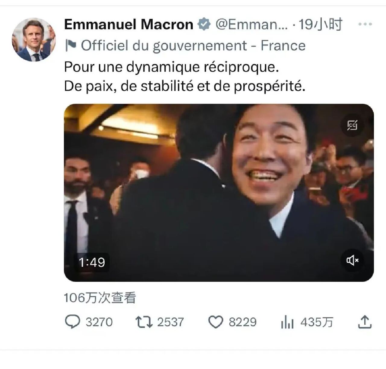 ▲ 馬克龍總統在個人社交平台上發佈,他在北京紅磚美術館與黃渤相擁時的合影,2023