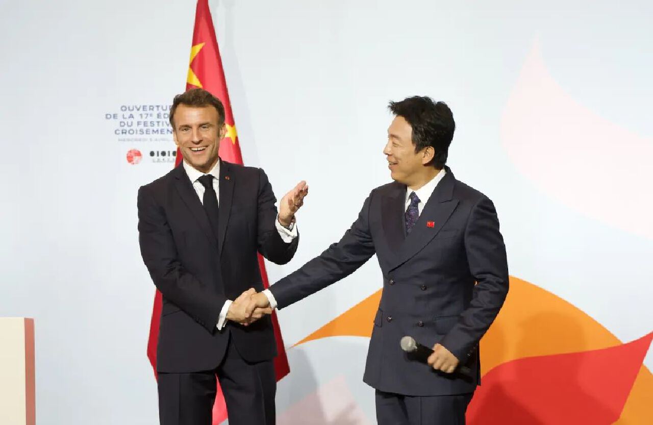 ▲ 法蘭西共和國埃馬紐埃爾·馬克龍(Emmanuel Macron)在第17屆“中法文化之春”藝術節開幕式上與本屆宣傳大使、演員、導演、中國電影家協會副主席黃渤一起宣佈“中法文化之春“正式啟動,圖源:紅磚美術館,2023