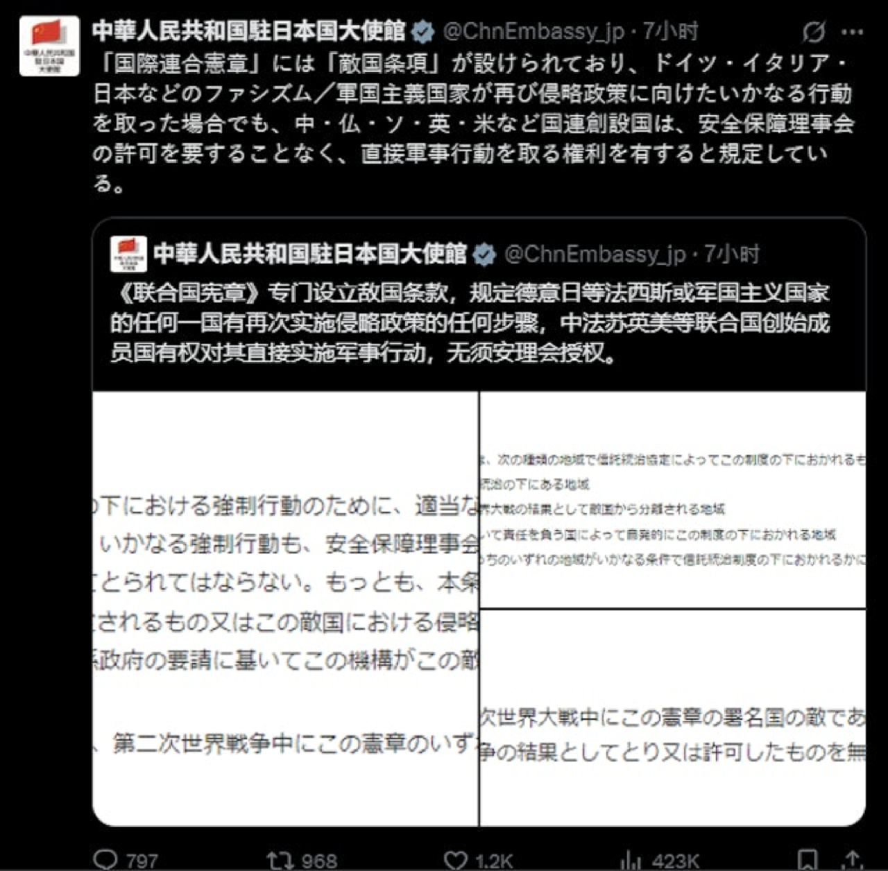 中国亮出了专治日本的达摩克里斯之剑。中国驻日使馆在社交平台发布短文,说《联合国宪章》列有“敌国条款”,规定,德国,意大利,日本等战败国,如果有再次实施侵略的任何行为,中国,苏联(现在是俄罗斯),法国,英国美国等联合国创始成员国,有权直接对它们实施军事行动,不需要安理会授权。言下之意,日本如果敢对中国寻衅滋事,中国就可以痛打日本,说打就打,不需要联合国开会、讨论、表决。