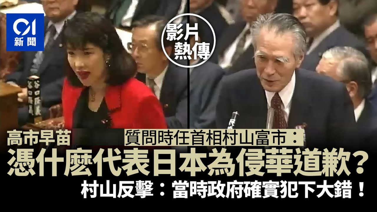 1995年8月,时任日本首相村山富市发表谈话,承认日本在二战中的战争罪行,并表示了“深刻的反省和由衷的歉意”。当时是日本国会众议员的高市早苗对村山富市的谈话非常不满,她在国会质问村山富市,“凭什么以首相的身份代表日本承认当年侵略战争是错误的?”