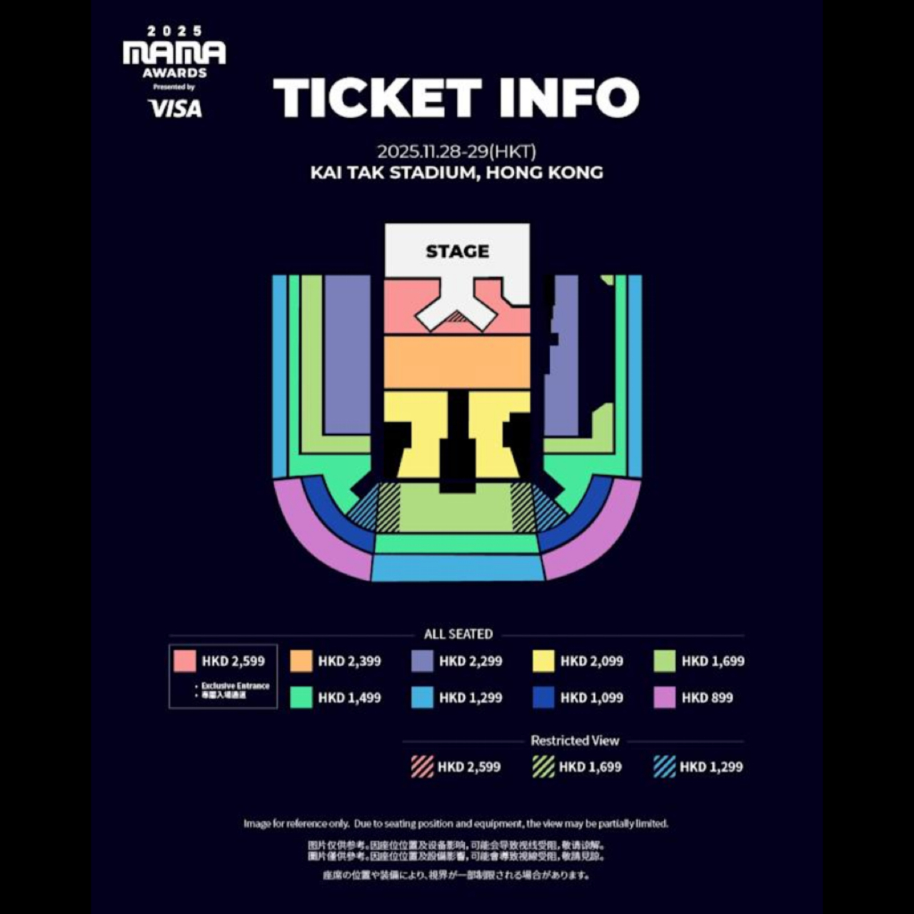視線受阻座位:HKD 2,599(專用入場通道)/ 1,699 / 1,299