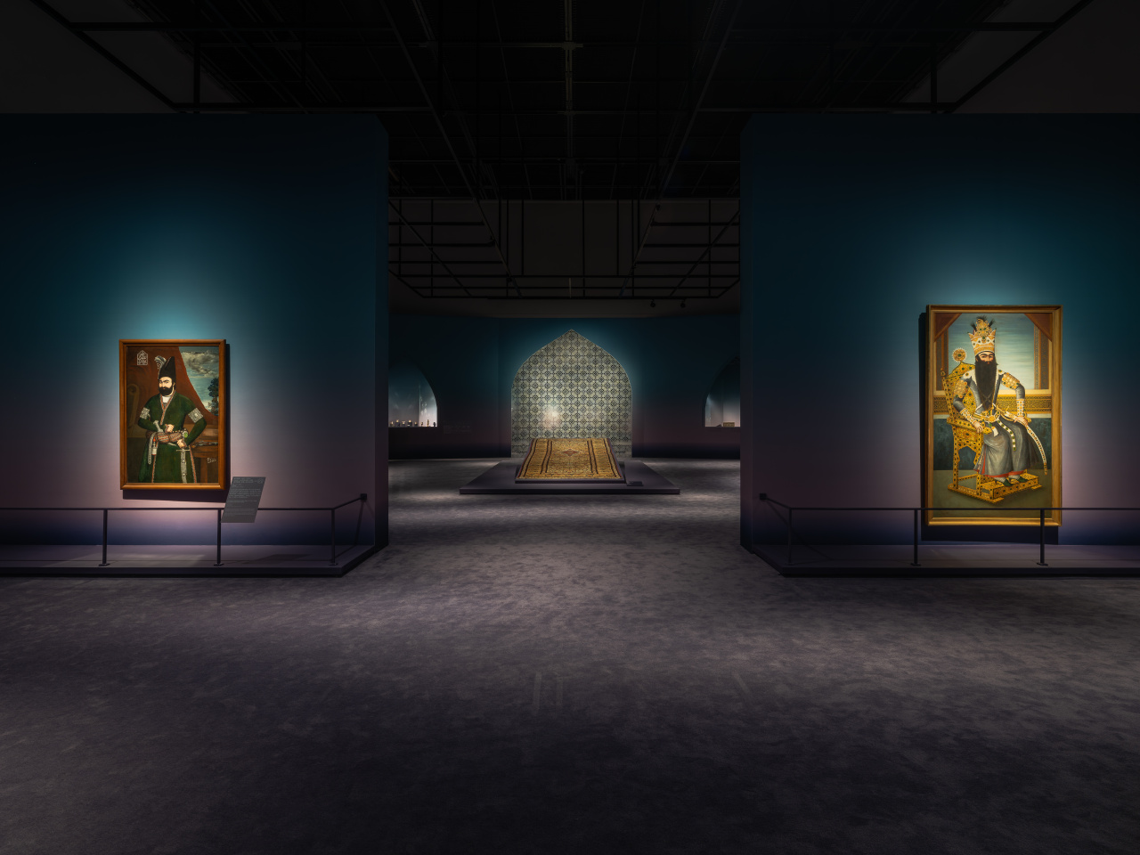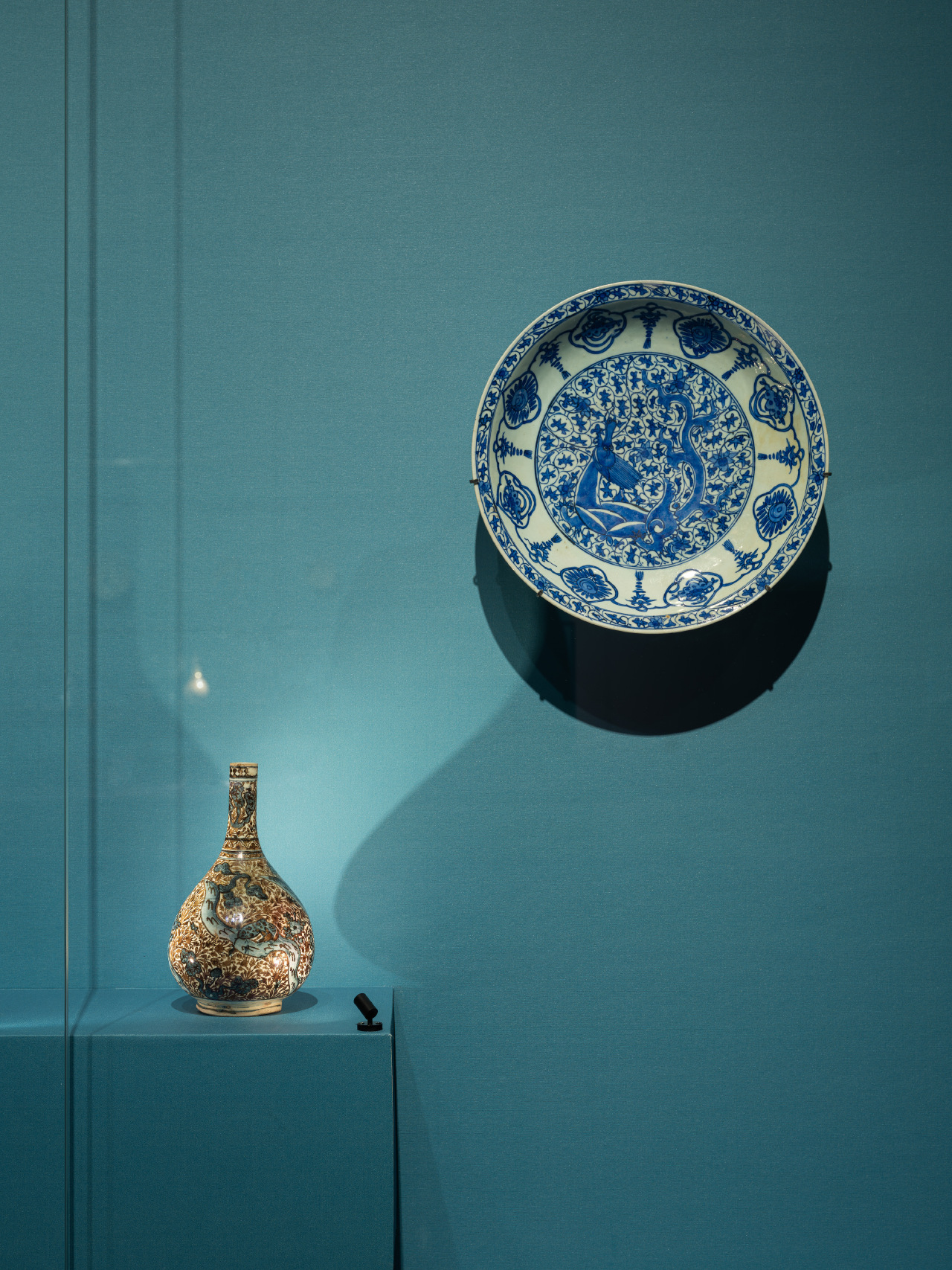 第二板塊展現伊朗藝術,生動詮釋了薩法維王朝和卡扎爾王朝紛繁的藝術成就。1501年,沙阿伊斯瑪儀一世建立薩法維王朝,以今伊朗為中心,版圖從亞美尼亞延伸至阿富汗。貫通東西的商貿推動了藝術發展的高度繁榮,締造了一個藝術創作的黃金時代:銘詩盤、獸鬥紋圓形飾板等彩陶器不僅具有實用價值,更承載了文學母題和詩歌意象,堪稱「會說話的藝術品」;動植物紋瓶等彰顯出華麗的「拉斯特彩」陶瓷裝飾技術,同時體現出中國青花瓷的紋樣如何融入薩法維藝術語言;王室與貴族的肖像油畫展現了本土藝術家吸收歐洲繪畫技術後的進化與突破;這一時期廣泛流行的琺瑯工藝也被運用至當地特色水煙壺的製作當中。19世紀,卡扎爾王朝統治下的伊朗更是視薩法維時期的藝術為典範。工匠們從歷史和文學中汲取靈感,這一潮流強化了民族認同感,並喚醒了輝煌的過去。