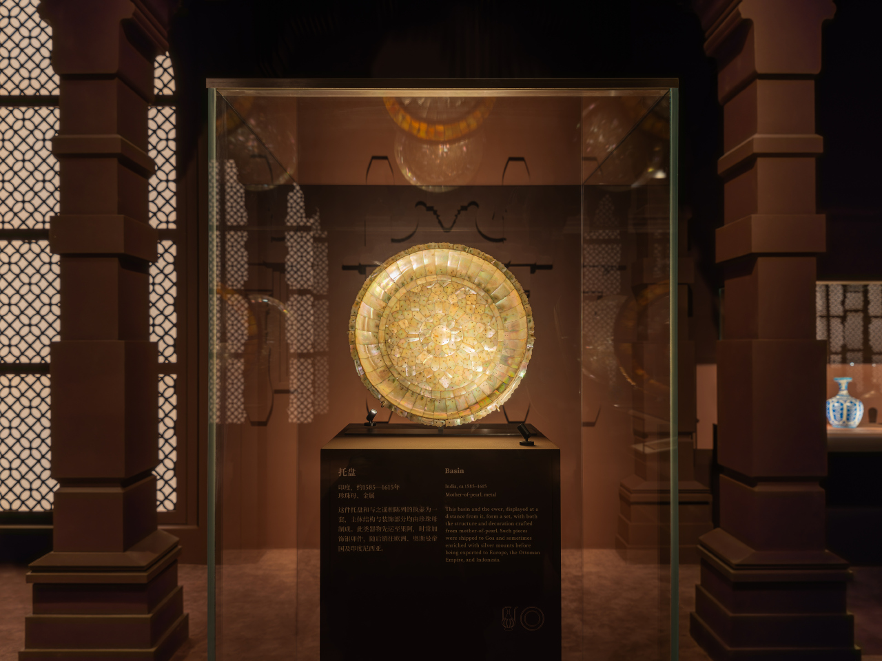第一板塊聚焦印度藝術。自1526年建立開始,莫臥兒帝國在鼎盛時期疆域幾乎覆蓋整個印度次大陸。自古以來,印度憑借地緣優勢,將本土文化和藝術廣泛傳播至各地。王朝在延續自身傳統的同時,不斷吸納來自周邊各地區的影響,創造出全新的美學風格。無論是融合了伊朗與中亞影響的賈利窗、體現本土與波斯傳統交融的珍貴玉器和金屬製品,還是歐洲與本地風格「混搭」的各式出口器物,無不彰顯出莫臥兒帝國傳承本源、融匯創新的藝術魅力。