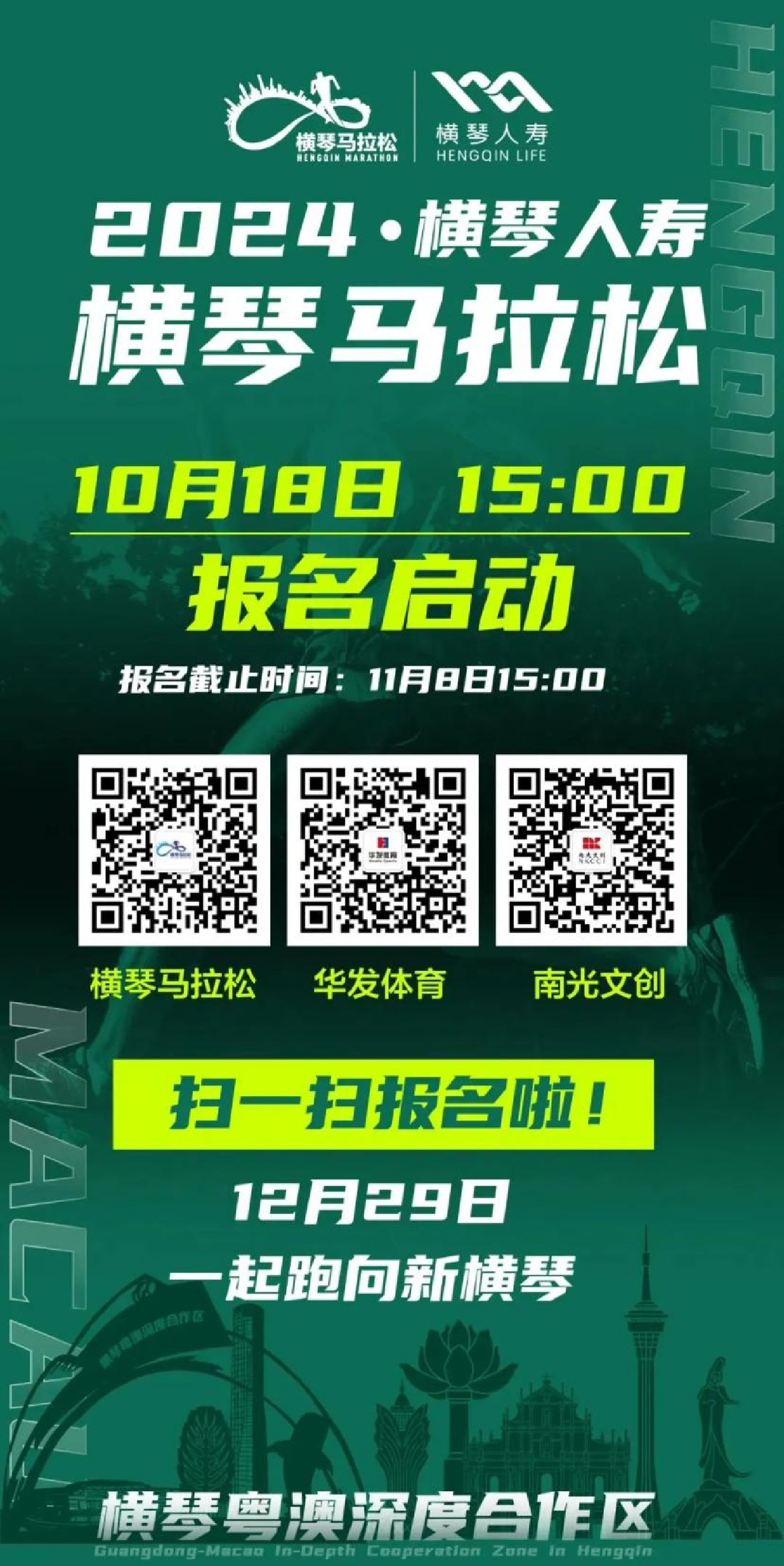 新橫琴,更精彩。12月29日,相約2024橫琴馬拉松,琴澳攜手共奏一曲同城奔跑的華彩樂章,見證深合區三周年的輝煌成果!