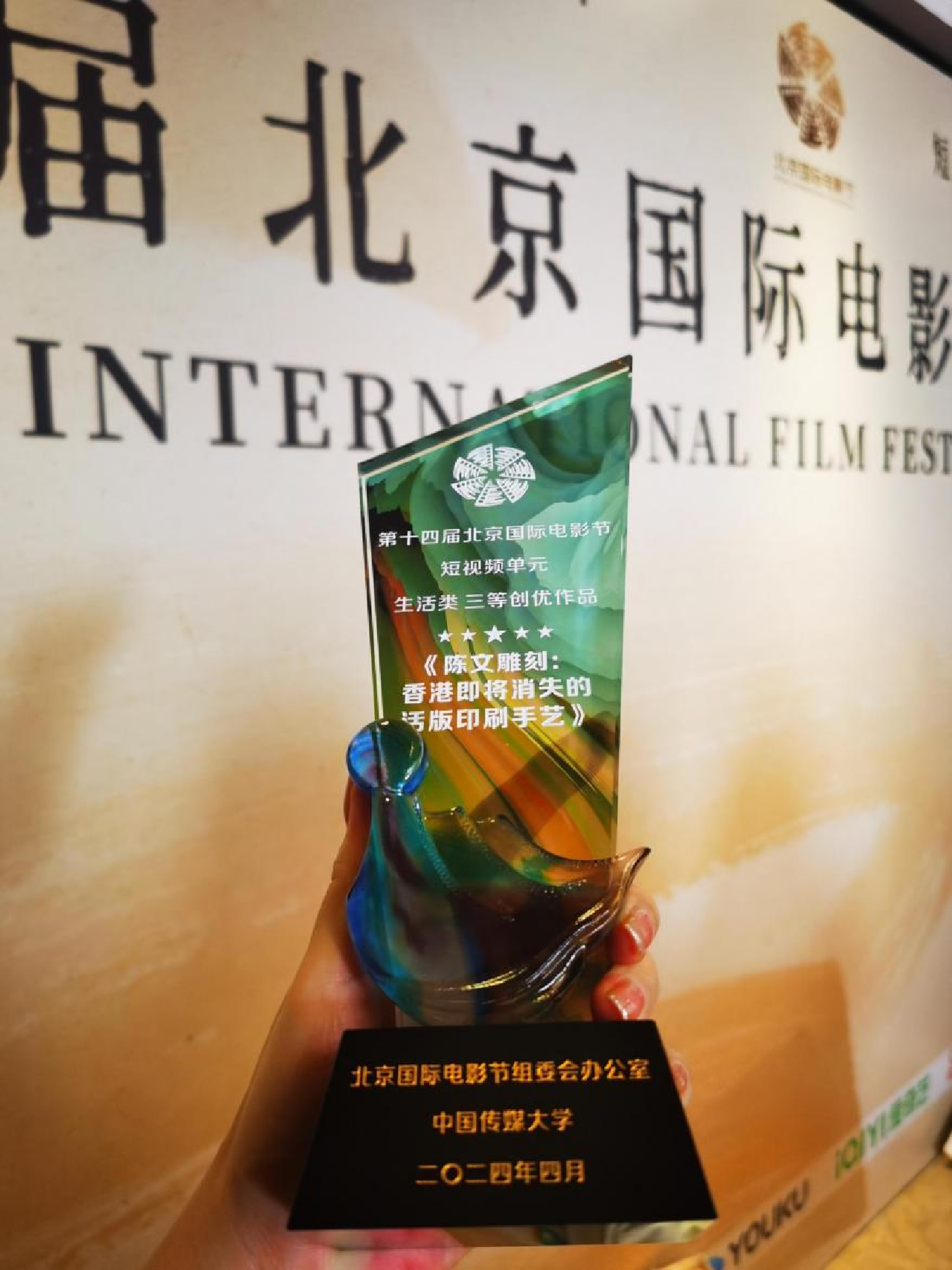 第十四屆北京國際電影節短視頻單元榮譽盛典2024年4月24日晚在北京舉行。鳳凰秀東西工作室原創視頻《陳文雕刻:香港即將消失的活版印刷手藝》喜獲生活類三等創優作品。